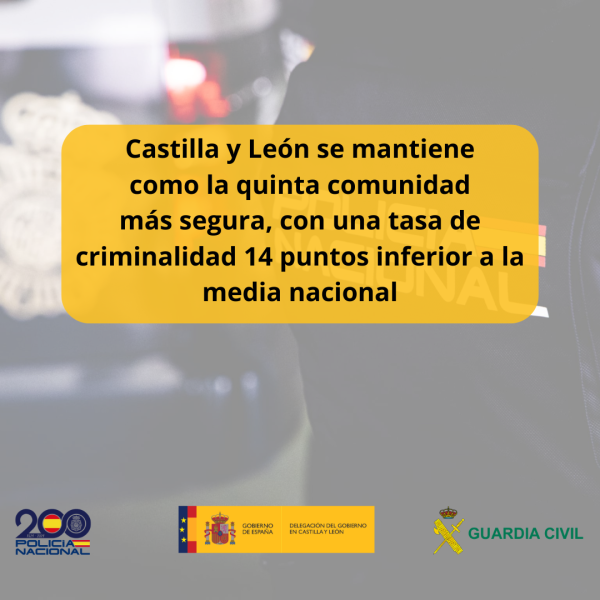 Os datos do informe de Indicadores de Seguridade do Ministerio do Interior correspondentes ao último trimestre do 2023 sinalan que Castela e León se mantén como a quinta comunidade máis segura de España, por detrás de Estremadura, Asturias, Galicia e Aragón. No lado oposto, sitúanse as Illas Baleares, Cataluña e Madrid, cunha taxa de criminalidade superior aos 60 puntos.
