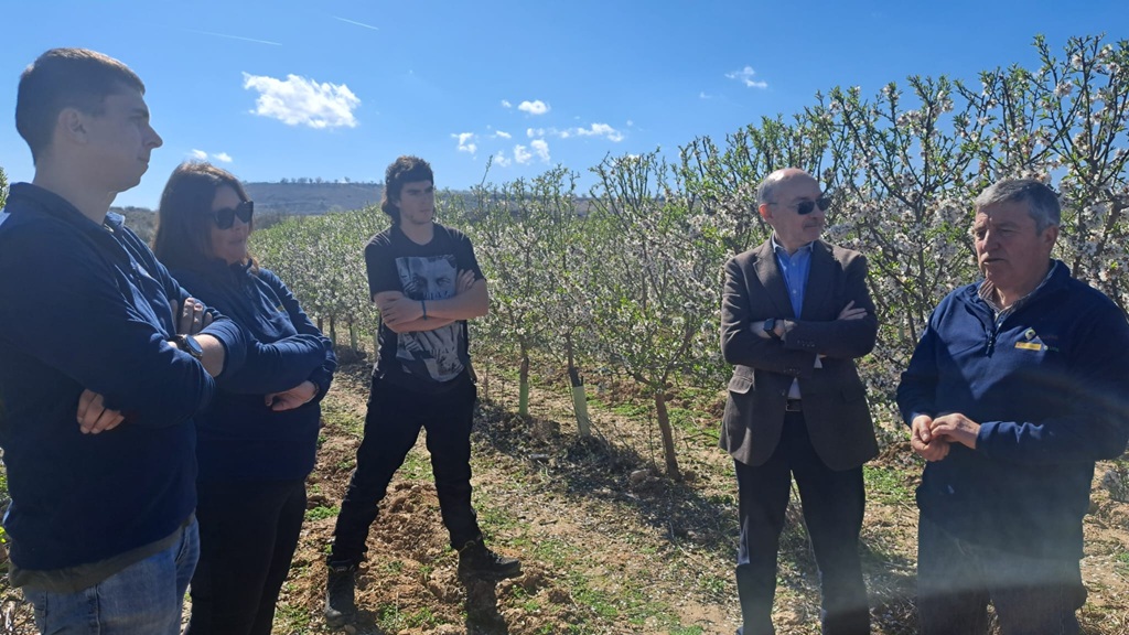 El delegado ha estado acompañado de José Manuel Roche, secretario general de UPA Aragón, entidad colaboradora del programa y dinamizadora de las prácticas en la explotación de Ainzón; y de Juan Pablo Bellido, propietario de la finca familiar Aljemi, dedicada principalmente a almendros y olivos. Además, han asistido los alumnos del programa de esta semana: Alberto Gimeno Lisbona, natural de Aniñón y propietario de una explotación de cereal, con alguna parcela de olivo y almendro; Leticia García Garín, de Fuentes de Ebro, que tiene una explotación de almendros en regadío; y Javier Calzada Pañero, de Cáceres, propietario de una explotación de pinos resineros y olivos en la que empezando a plantar frutales y almendros.