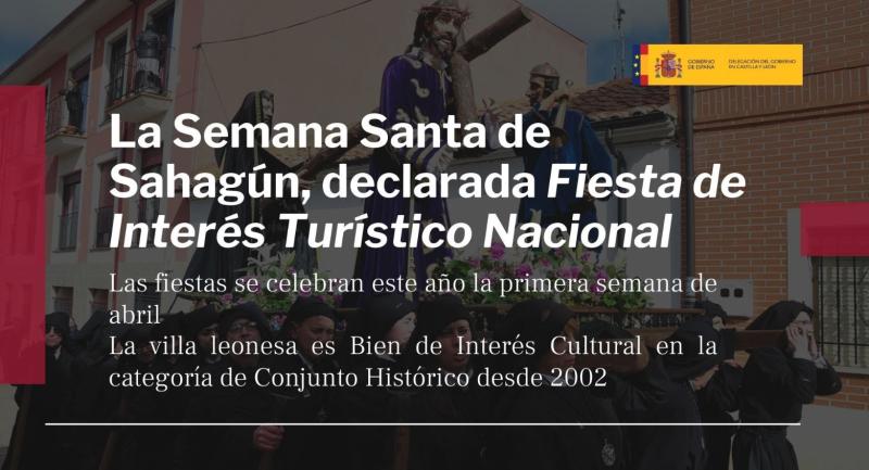 6 de septiembre de 2023.- La Semana Santa de Sahagún (León) ha sido declarada hoy Fiesta de Interés Turístico Nacional por el Ministerio de Industria, Comercio y Turismo, a través de la Secretaría de Estado de Turismo. La singularidad de esta celebración, que data del siglo XVI, se suma a la condición de la villa leonesa como Bien de Interés Cultural, distinción que le fue concedida en 2002 en reconocimiento a su singular conjunto histórico.