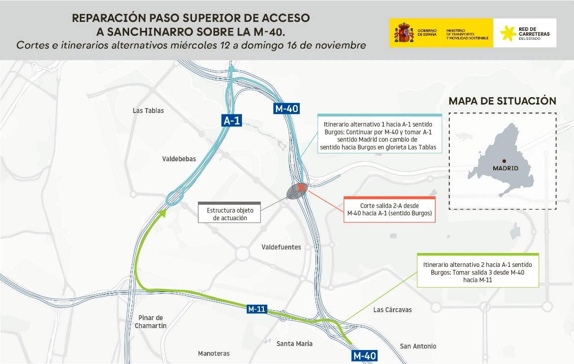 Para llevar a cabo las actuaciones previstas es necesario realizar trabajos sobre la estructura del paso superior, lo que ha requerido el corte del tráfico sobre el citado paso superior desde la noche del pasado 12 de octubre. Este corte se prolongará hasta la finalización total de los trabajos. La incorporación desde Sanchinarro hacia la M-40 sentido Norte se realiza a través de la Avenida de Niceto Alcalá Zamora, la Avenida de Santo Domingo de la Calzada y la Avenida del Camino de Santiago.